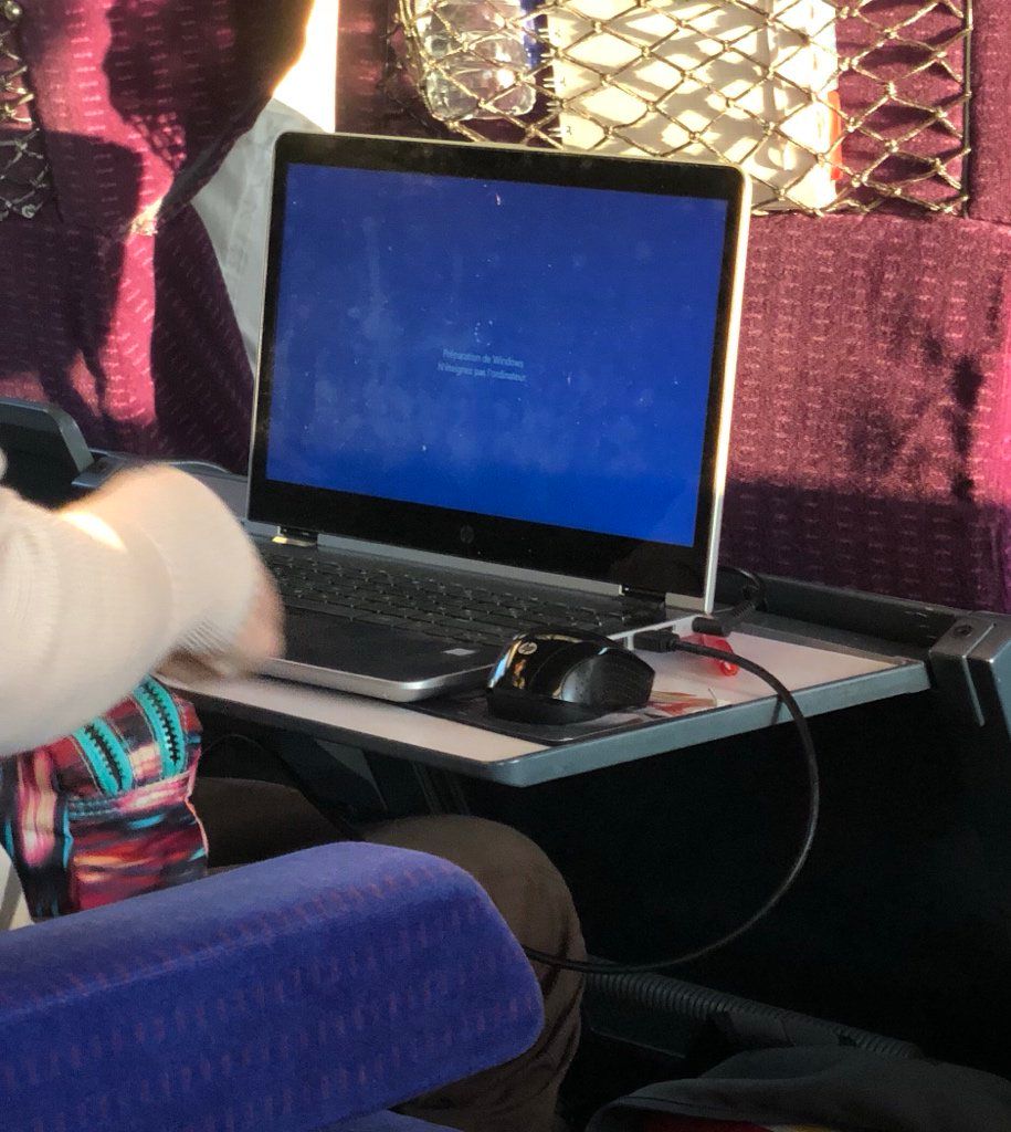 Je ne sais pas ce que je préfère : la souris posée sur la minuscule surface à côté de l’ordinateur, ou Windows qui va se mettre à jour au démarrage.