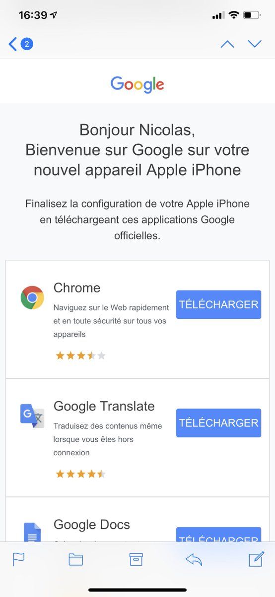J’ai trois comptes Gmail, j’ai donc reçu trois fois ce mail pour me prévenir qu’il me manquait des apps Google sur mon nouvel iPhone. 🙄