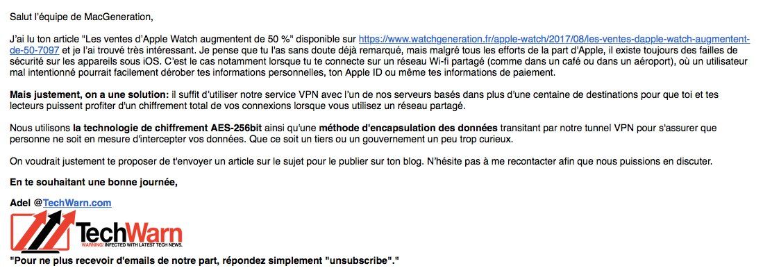 Vendre un VPN à partir d’un article sur les ventes d’Apple Watch, il fallait oser. Un article de 2017, tant qu’à faire.