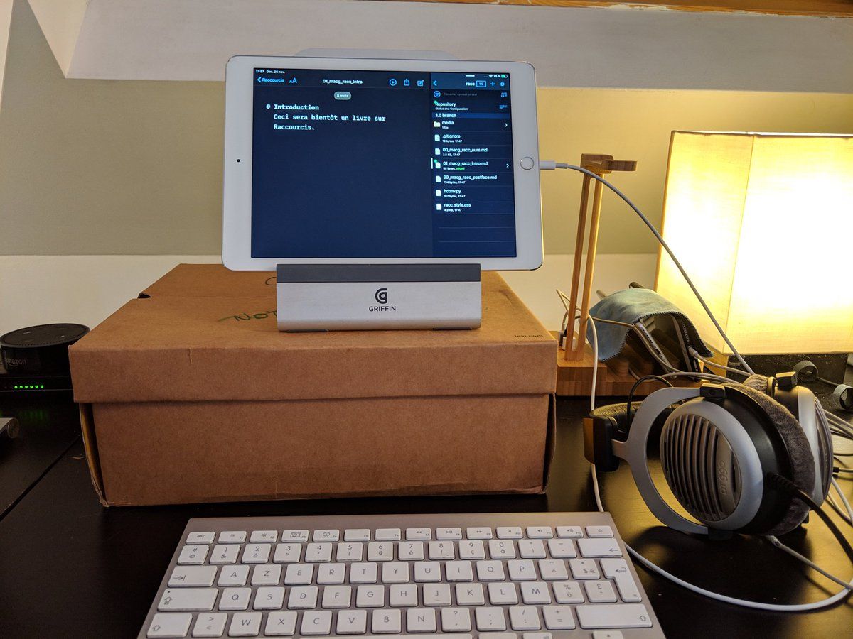 En attendant un iPad Pro, je me suis bricolé un poste de travail pour écrire Raccourcis. Mais c’est un petit écran pour ça et cet iPad Air 2 aime pas trop le multitâche. Ça rame sévère…