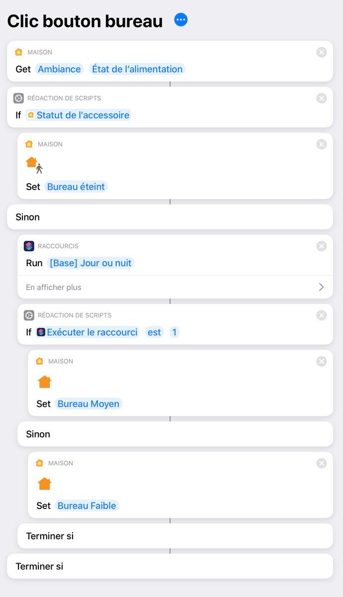 Pour info, je voulais activer ce raccourci qui active une scène la nuit et une autre le jour. Je peux tout refaire dans l’app Maison, mais c’est intenable, je voulais utiliser cette base pour d’autres boutons. Sachant qu’on ne peut pas copier/coller des actions…