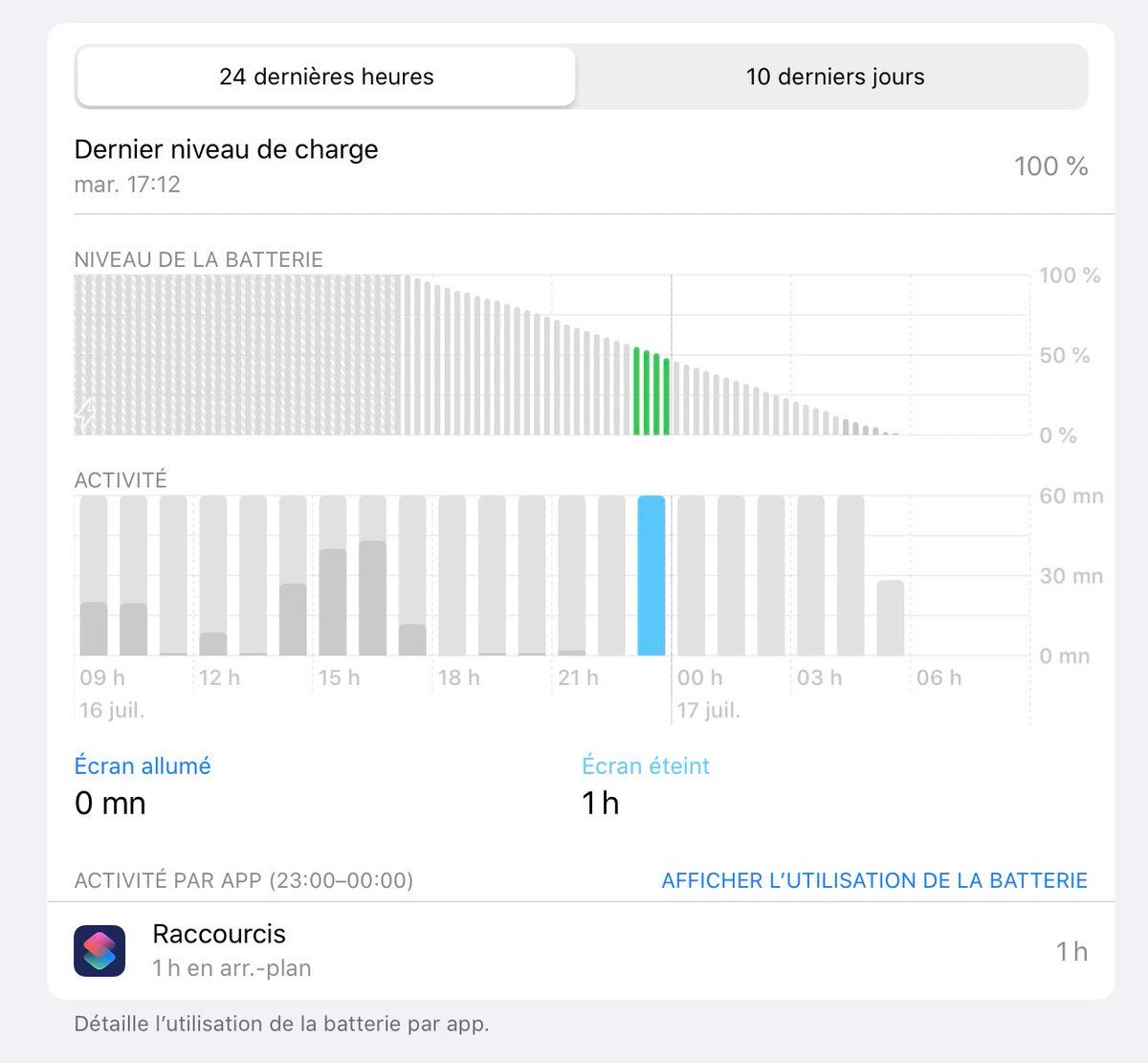 Raccourcis a méthodiquement vidé la batterie de mon iPad cette nuit. Une baisse régulière vraiment très propre ! 👌