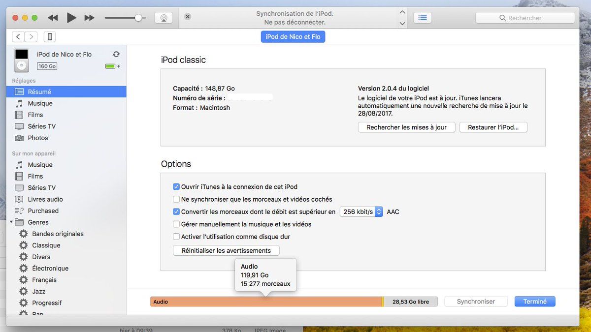 Reste maintenant à remplir tout ça. Merci l’option d’iTunes pour tout convertir à la volée, par contre, va falloir patienter un moment…
