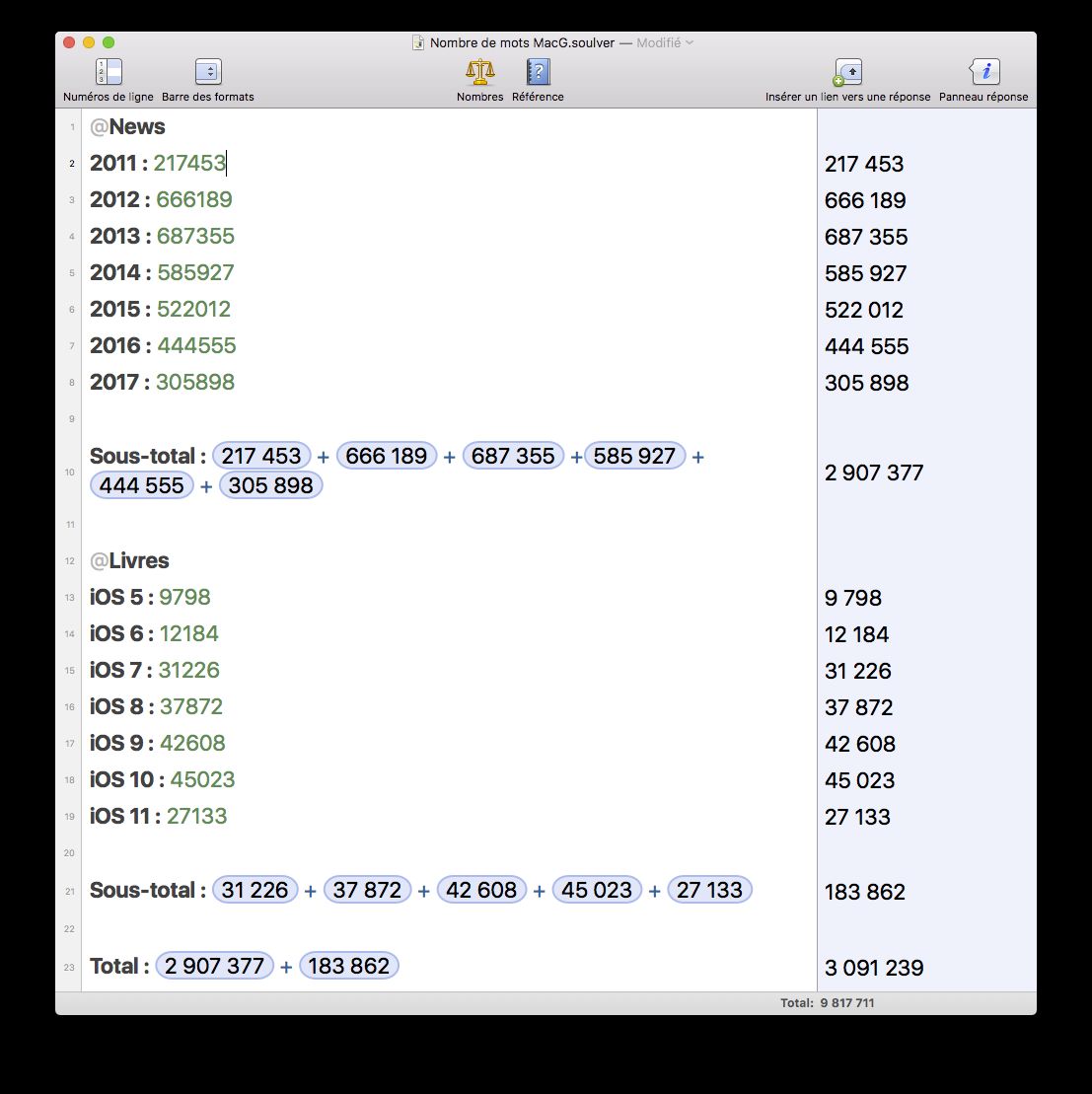 , voici combien de mots j’ai écrit pour MacG. Bilan incomplet, les premières années je stockais pas en MD…