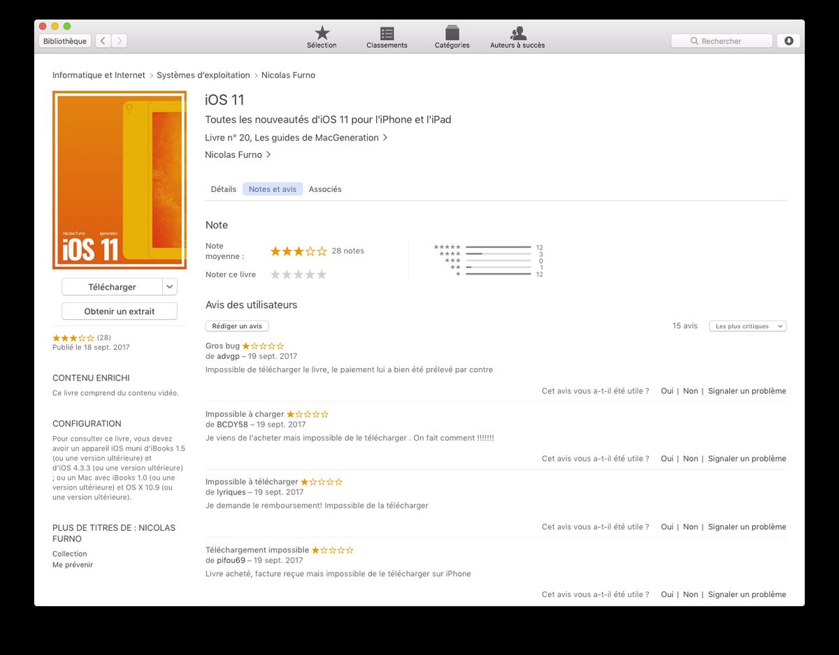 iBooks Store : sur les 15 avis déposés, dix se plaignent de pas réussir à télécharger le livre. 10 ! Sur 15 ! Comment est-ce possible ? 🙄😡